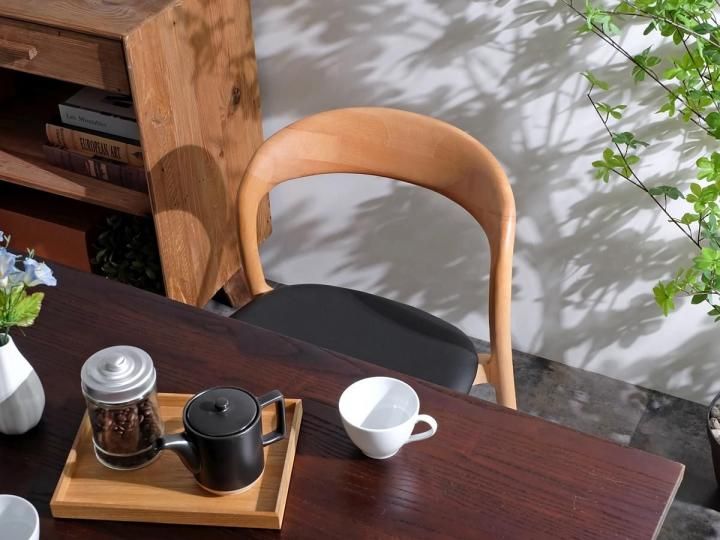 木の温もりを感じるウッドフレームと高級感のあるレザーシートの組み合わせが秀逸で