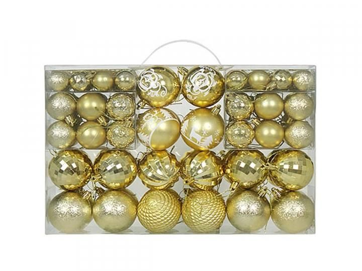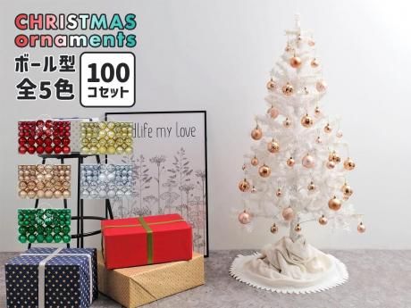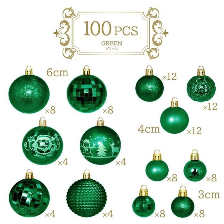 直径3〜6cmのボール型オーナメントが13種類・計100個入った大容量セットとなっており、